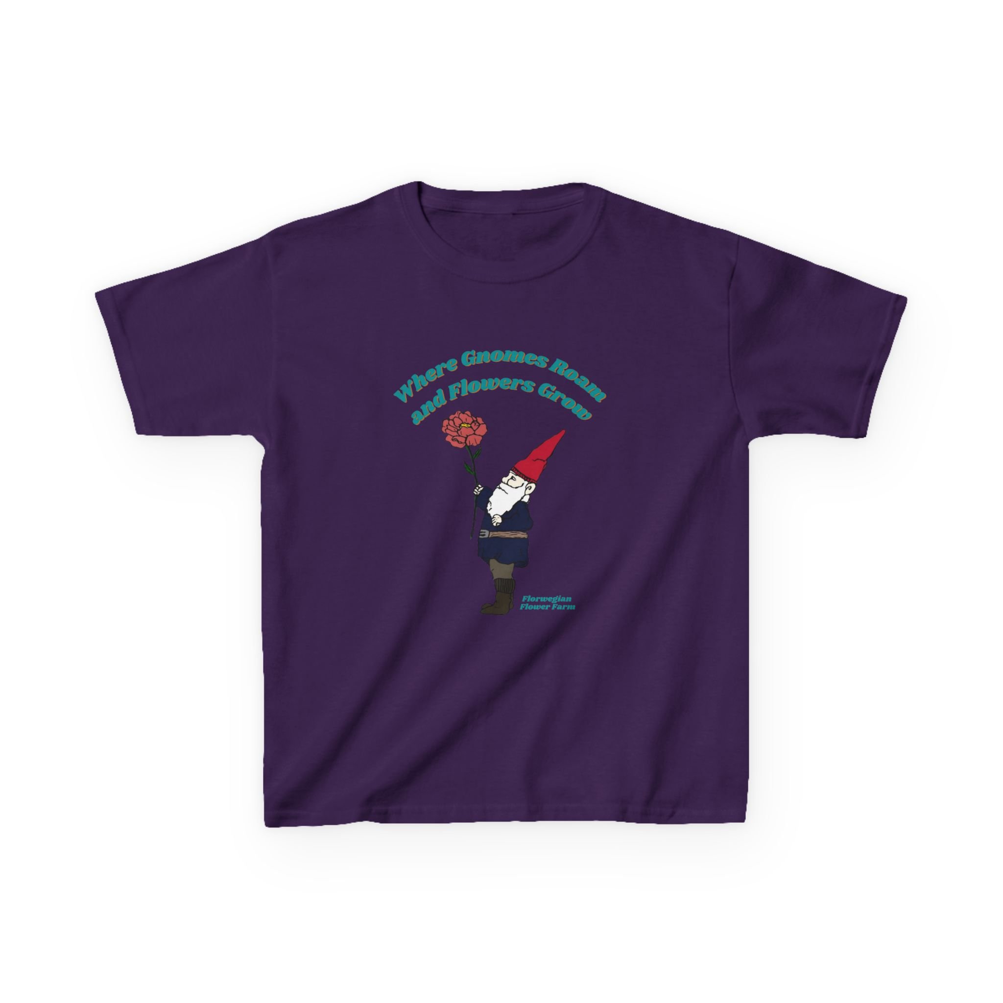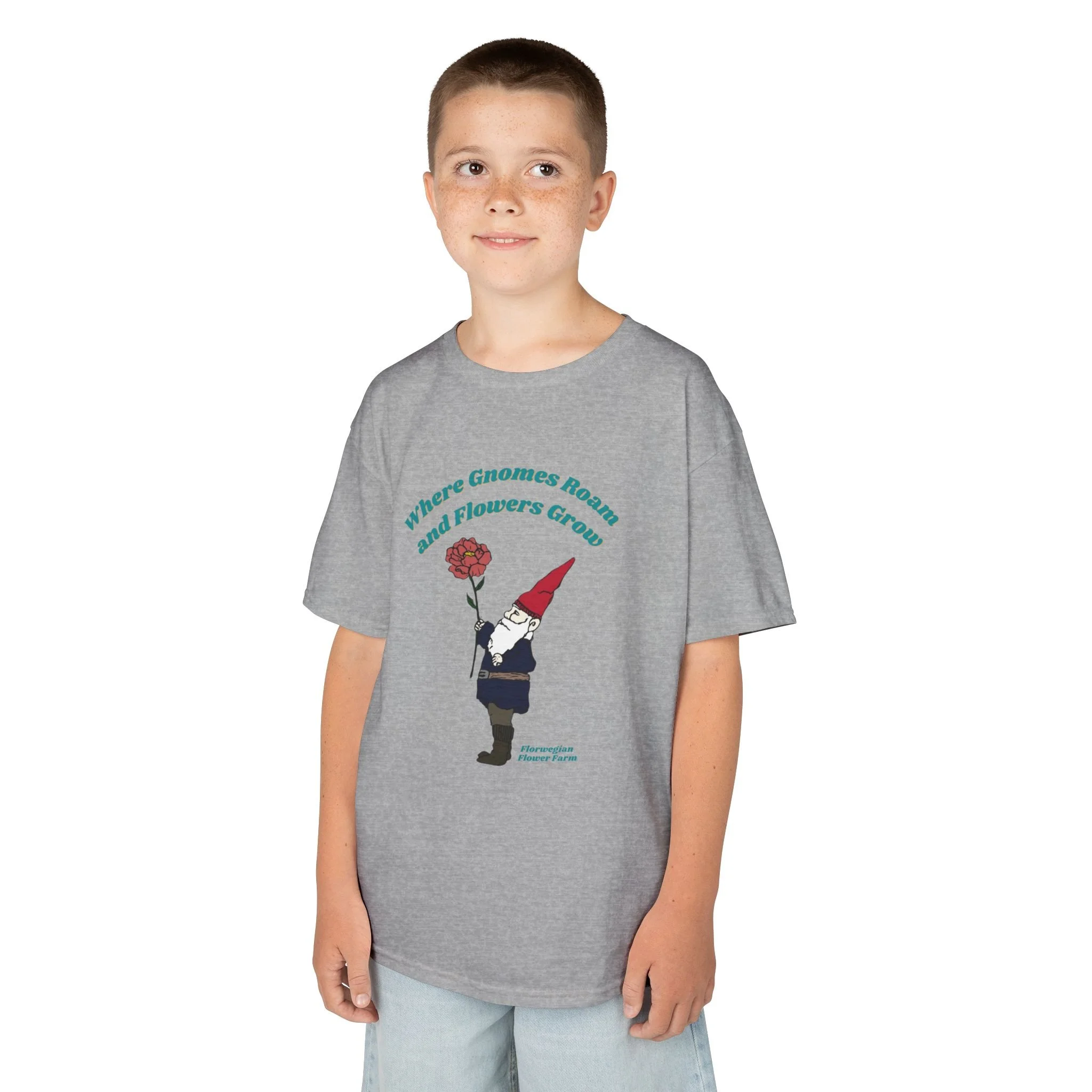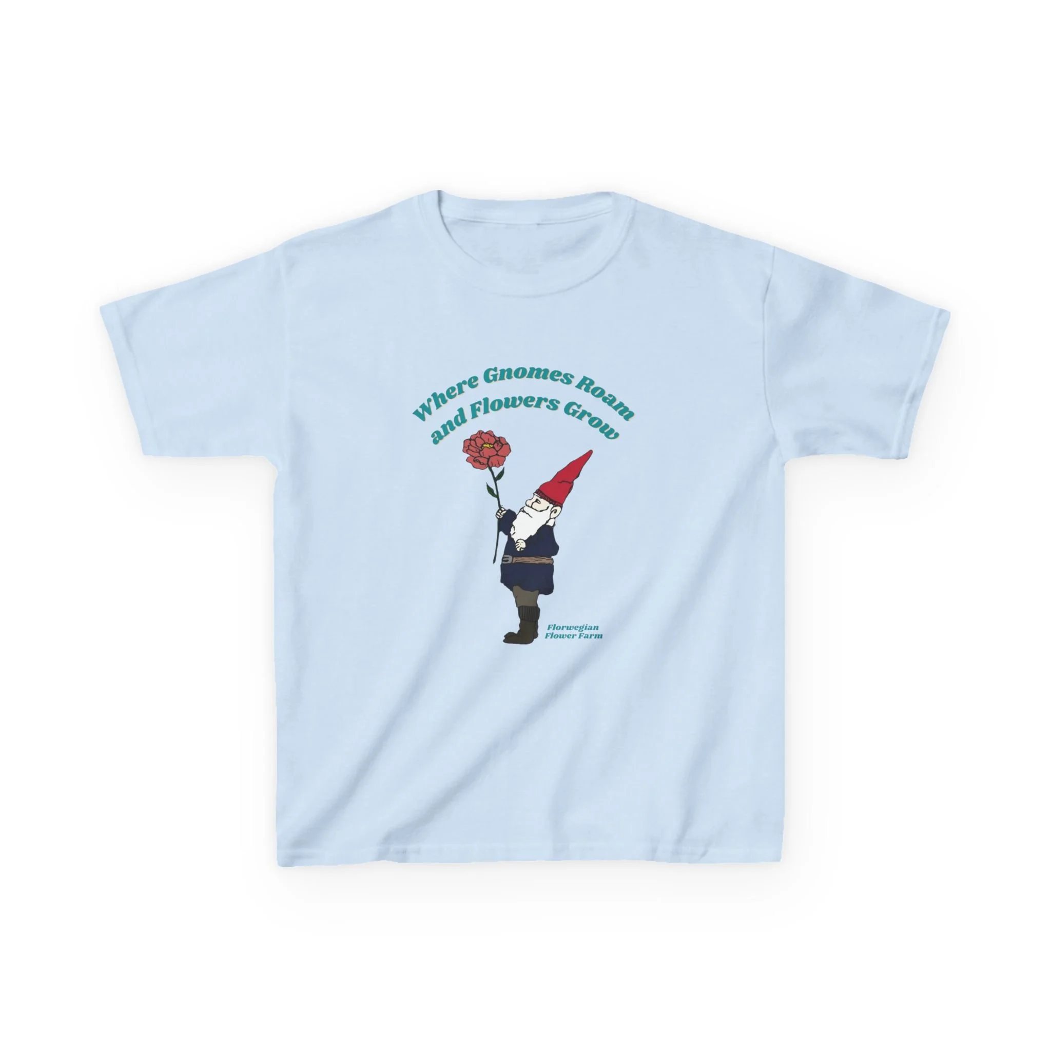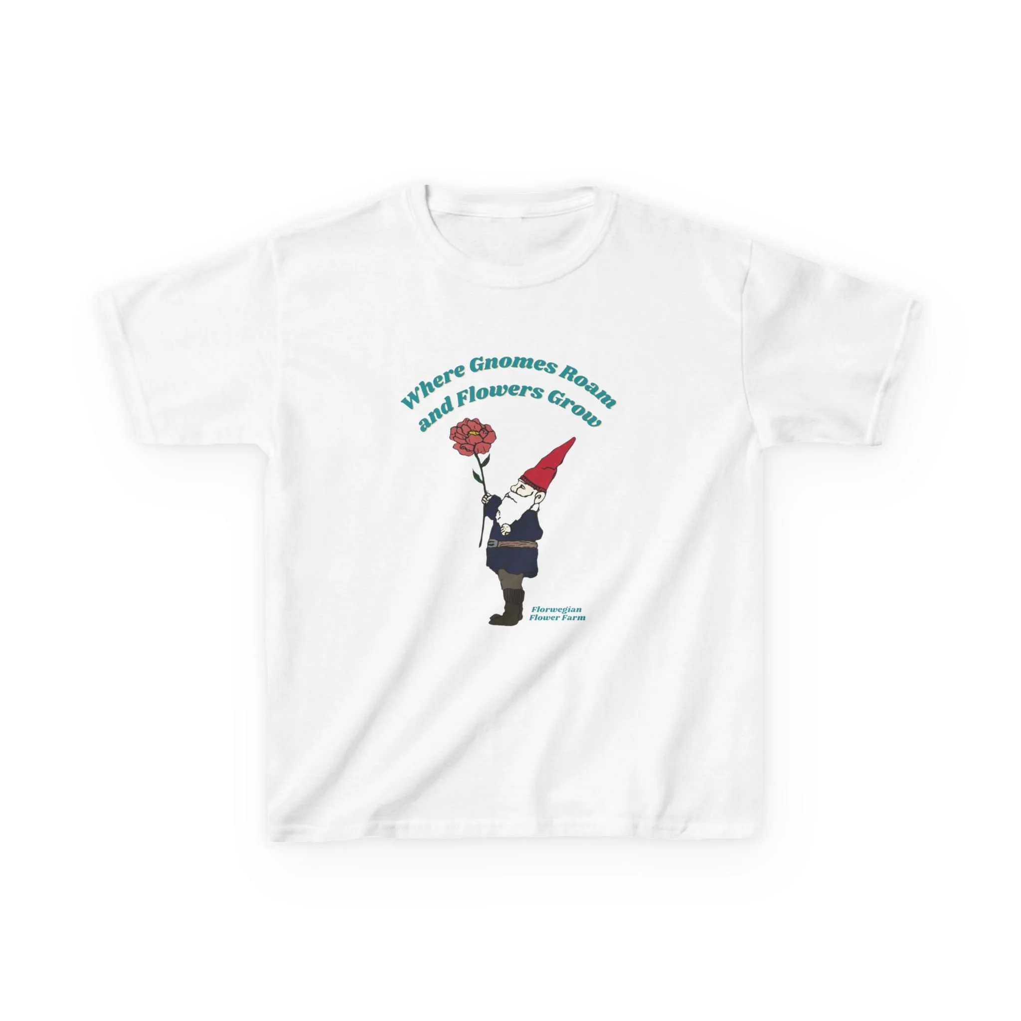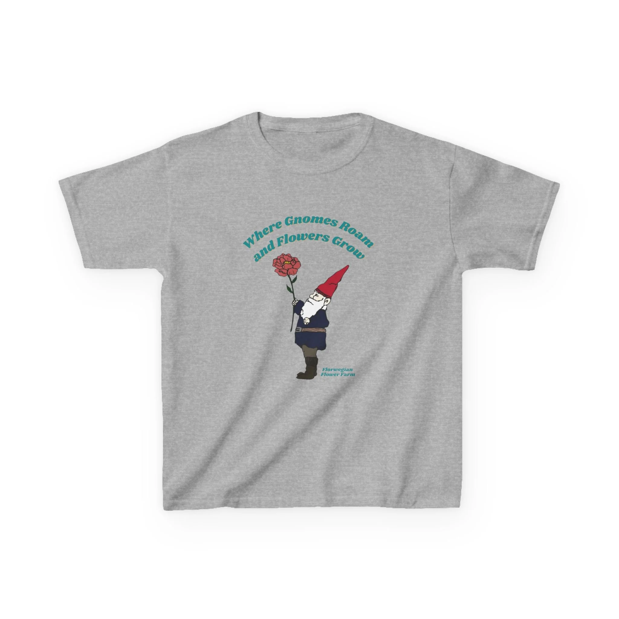 This soft, midweight kids tee brings a touch of whimsical garden magic to everyday wear. A little gnome, bright red hat and single blooming flower sit centered on the chest beneath a gentle arch of text, creating a playful, storybook feel. The comfortable crew neck and classic cut let kids move freely while the smooth, ethical cotton keeps them cozy.